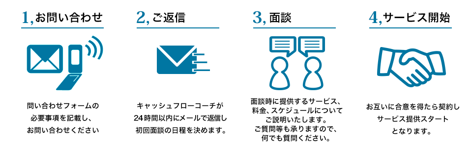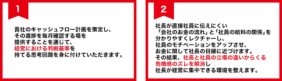 キャッシュフローコーチは、単なる数字を分析する役割だけではなく、 経営数字を意思決定のツールとして使う手助けの役割も果たします。 そのため、経営者が目指すビジョンを言語化することや、ビジョン実現のためのアクションプランを策定するお手伝いもします。 今まで自分が本当にしたかったことができない理由は、もしかすると、「重要だけど緊急ではない」ことに時間を割けなかったからではないでしょうか? キャッシュフローコーチとの毎月の面談が習慣になれば、そんな先送り癖もなくなります。 キャッシュフローコーチと向き合うことで、半ば強制的に経営者が、自分が本当にしたいことにフォーカスする時間が作れます。