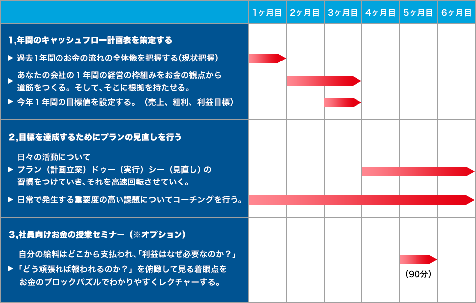 一方で、計算された売上目標があまりにも現実離れしてしまうことがありますので、社長が実現可能で根拠を持って行えると思える計画になるまで、何度も計画を作り直します。「お金のブロックパズル」を用いて決定した理想の収支構造を、A3用紙1枚で俯瞰できる「キャッシュフロー計画表」に落とし込みます。